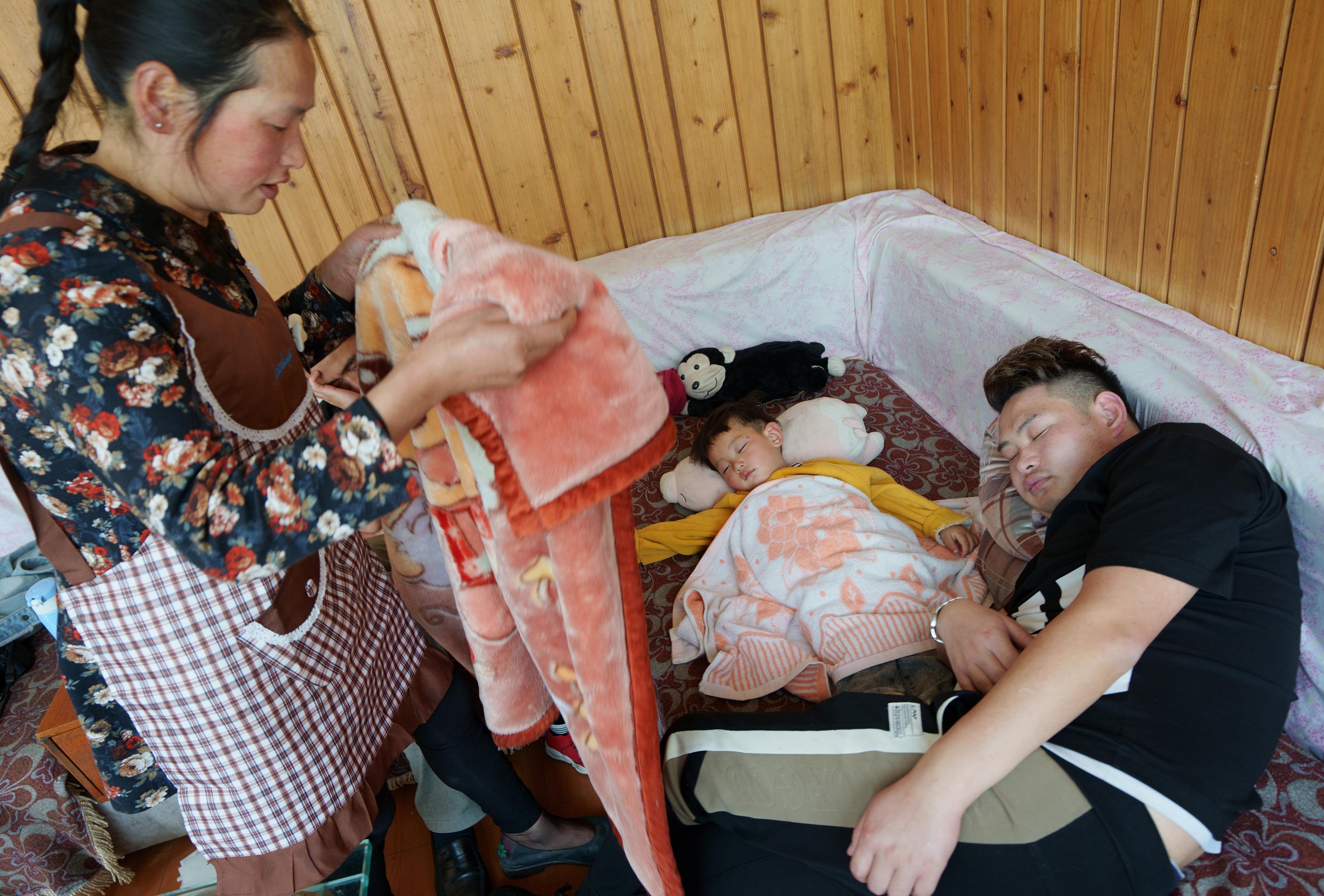 ↑5月4日,李芸香(左)给午睡的儿子邱超(右)、孙子邱早睿盖毛毯。