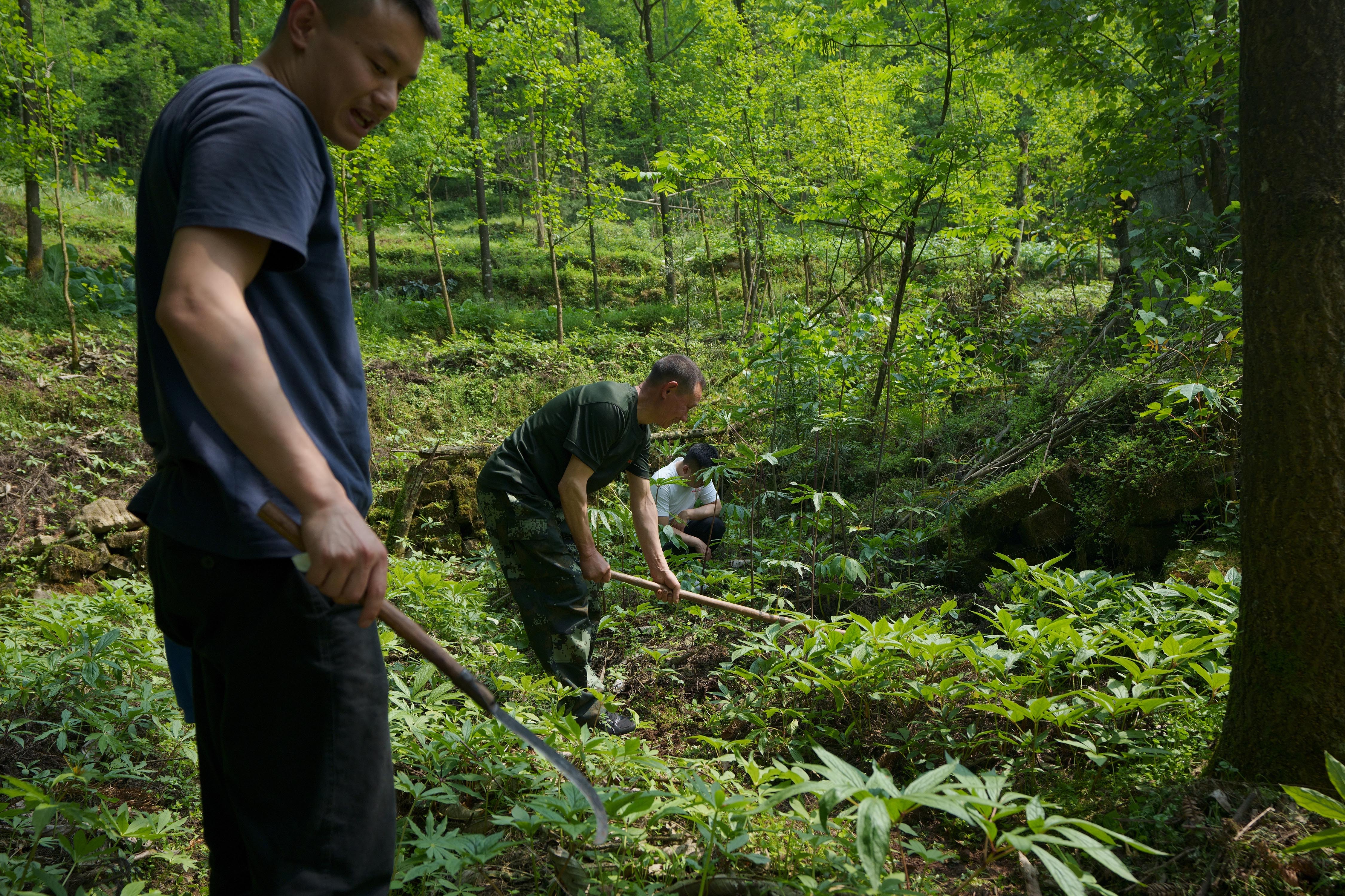 ↑5月4日,林兴聪(中)和儿子林顺坪(左)、女婿刘永锋为地里种植的药材除杂草。