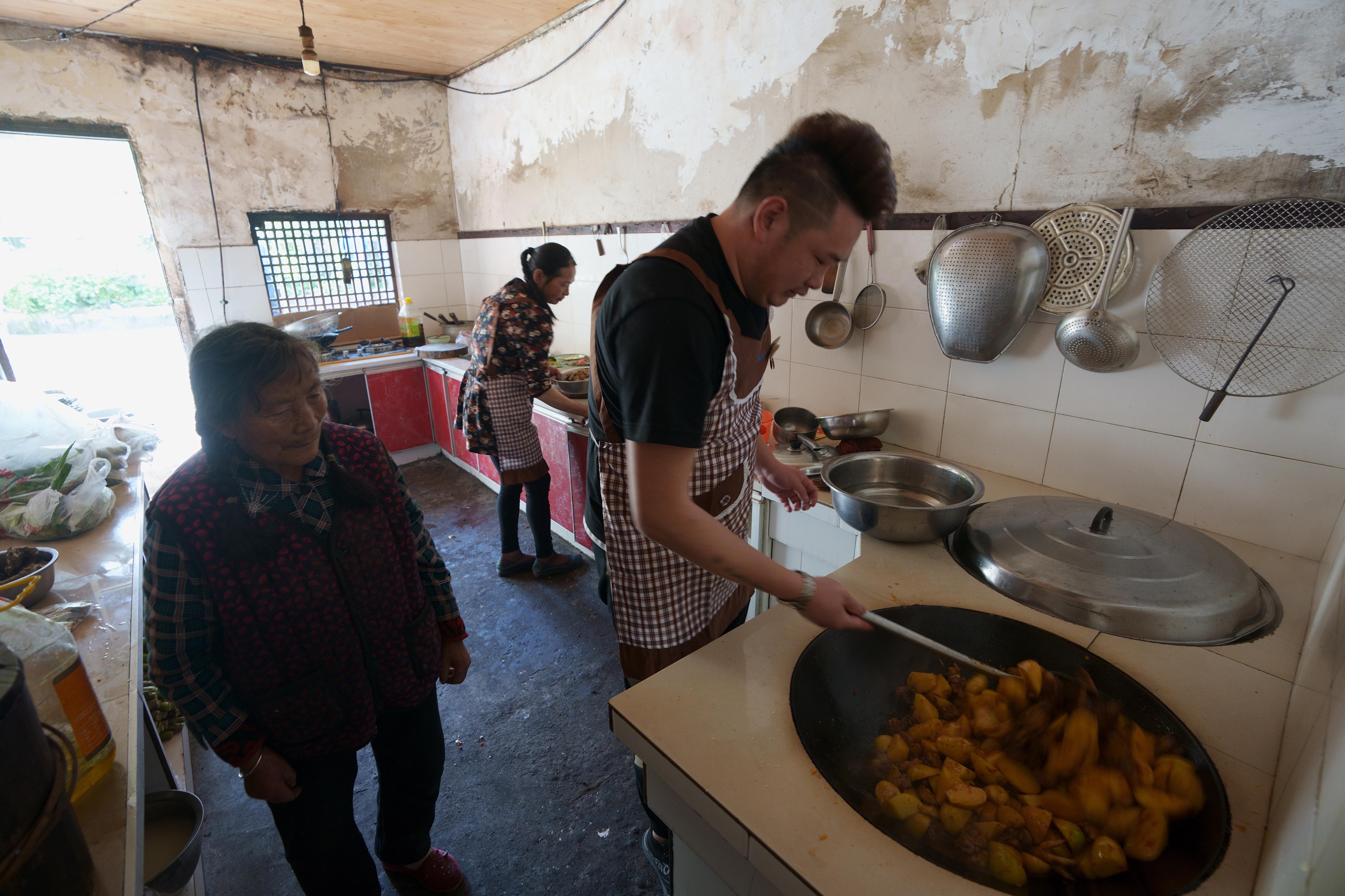 ↑5月4日,邱超(右)和母亲李芸香(中)、奶奶在厨房准备饭菜。