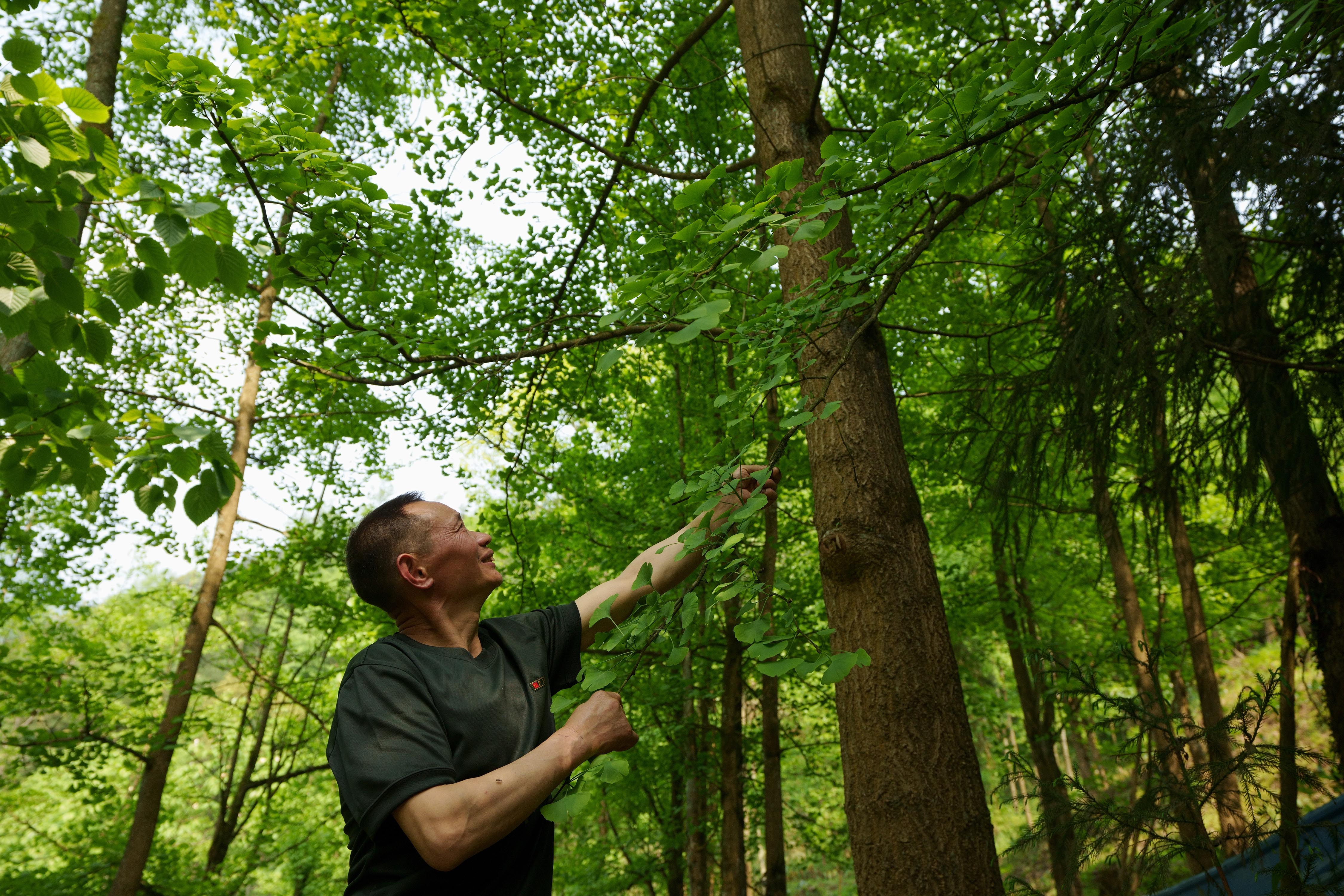 ↑5月4日,林兴聪在自家林地里看着茁壮成长的银杏树。