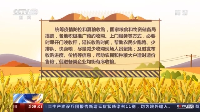统筹疫情防控和夏粮收购,国家粮食和物资储备局提醒,各地积极推广预约收购、上门服务等方式,必要时早开门晚收秤,延长收购时间,帮助农民少跑路、少排队、快卖粮,尽量减少收购现场人员聚集;及时发布收购进度、价格等信息,帮助农民和种粮大户适时适价售粮,促进各类企业均衡有序收粮。