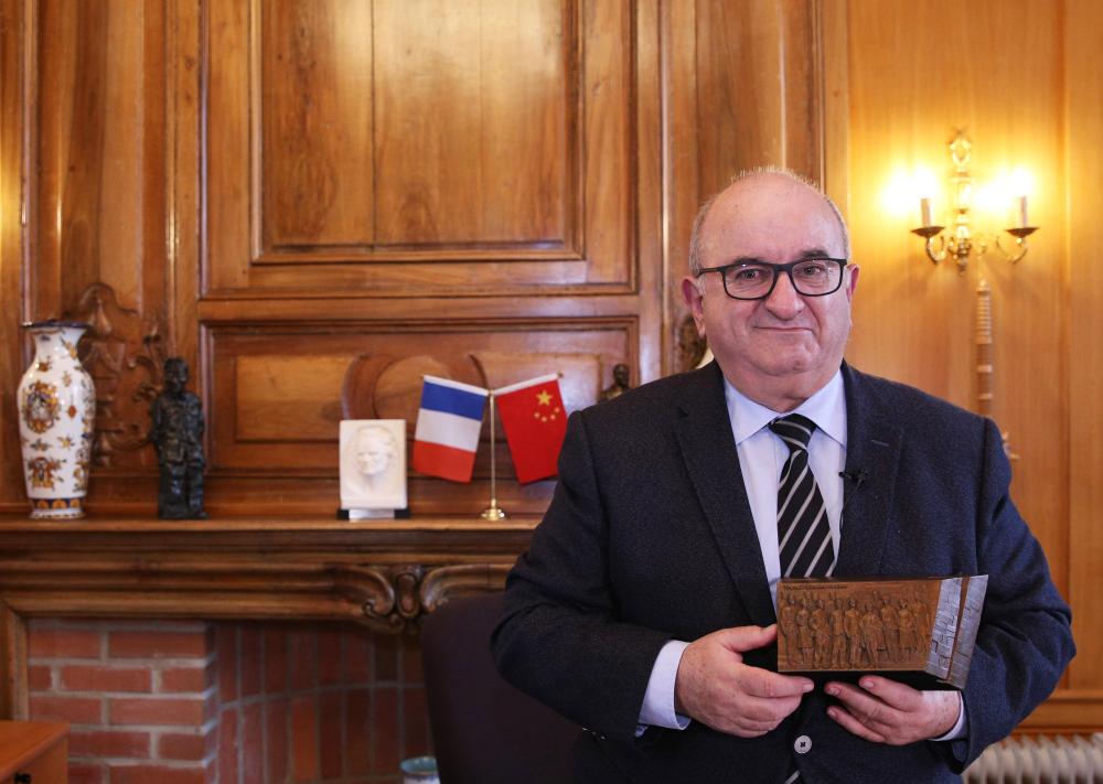 3月22日,法国蒙达尔纪市市长伯努瓦·迪容在办公室展示《百年丰碑》雕塑模型。(新华社记者高静摄)