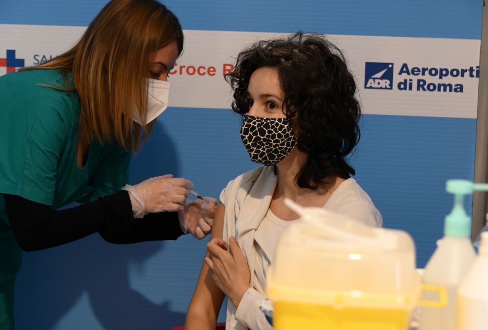 2月11日,在意大利罗马菲乌米奇诺机场设立的一处新冠疫苗接种点,一名医务工作者在接种新冠疫苗。(新华社发,阿尔贝托·林格利亚摄)