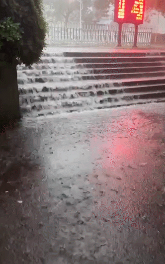 强降水致使武汉一地楼梯变瀑布。(来源于湖北天气的微博视频)