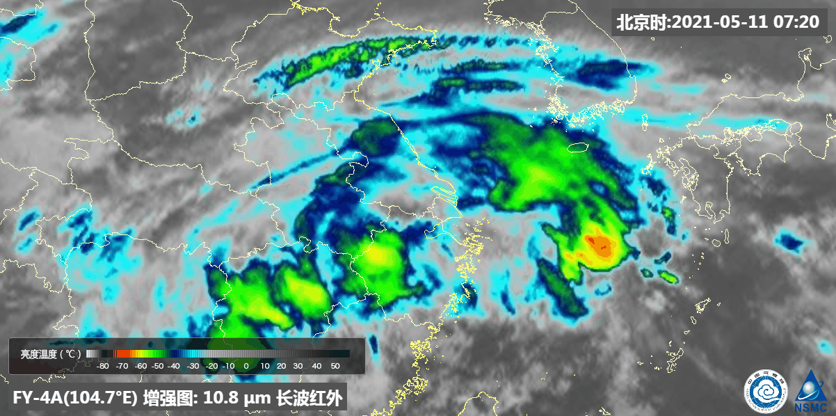 图2.FY-4A 静止气象卫星红外增强图 2021 年 5 月 11 日 7:30 时至 9:00 时(来源于中央气象台)