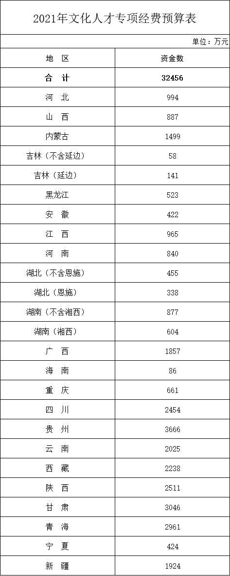 人民网北京5月12日电 (记者 王震)据财政部网站12日消息,为进一步加快边远贫困地区、边疆民族地区和革命老区(以下称“三区”)等文化人才队伍建设,财政部向22个省(区、市)下达2021年文化人才专项经费预算,合计3.2亿元。财政部要求,有关省(区、市)需切实加强资金管理,做好人才选派等工作的组织实施,并落实应负担的相关经费。