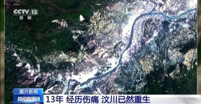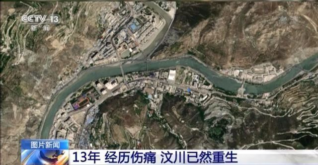 这张是卫星最新拍摄的汶川新貌。当年泥石流留下的白色痕迹已基本不见,映入眼帘的是满眼青山和鳞次栉比的房屋,历经伤痛,汶川已然重生。