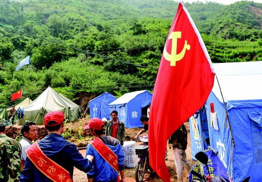 二零一四年八月八日,在云南鲁甸县龙头山镇的集中安置点,一面党旗插在临时帐篷上。鲁甸六点五级地震发生后,鲜艳的党旗飘扬在灾区各处,共产党员奋力带领群众抗震救灾。新华社记者蔺以光摄