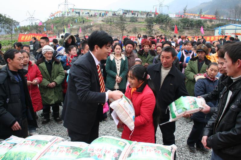 邹凌(前左)为映秀镇村民发放物资。(渔子溪村供图)