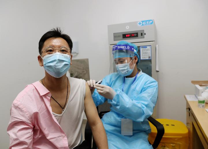 4月19日,全国台湾同胞投资企业联谊会会长李政宏在上海接种新冠疫苗。新华社记者刘颖