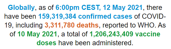 根据世卫组织最新实时统计数据,截至欧洲中部夏令时间5月12日18时(北京时间5月13日0时),全球累计新冠肺炎确诊病例159319384例,累计死亡病例3311780例。12日全球新冠肺炎确诊病例新增643091例,死亡病例新增11726例。(总台记者 朱赫)