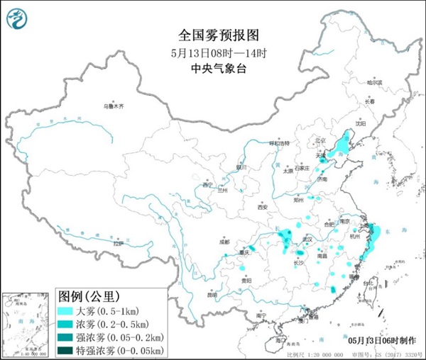 中央气象台5月13日6时继续发布大雾黄色预警: