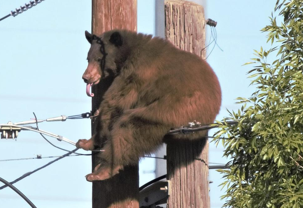 美国亚利桑那州道格拉斯,一只棕熊爬上当地电线杆,引来民众围观。