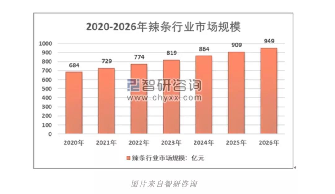 辣条作为细分市场,近年来规模迅速扩大。根据智研咨询发布的《2020-2026年中国辣条产业发展态势及投资盈利分析报告》显示,2019年辣条行业市场规模为651亿元,年复合增长率为8.59%,估计到2026年有望达到949亿元。
