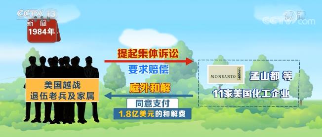1979年,美国越战退伍老兵及家属对11家美国化工企业提起集体诉讼,要求各公司就除草剂造成的美军士兵伤亡及后代畸形进行赔偿。虽然各大化工企业坚称使用除草剂为政府行为、与公司无关,但还是在1984年与退伍老兵达成庭外和解,同意支付1.8亿美元费用。