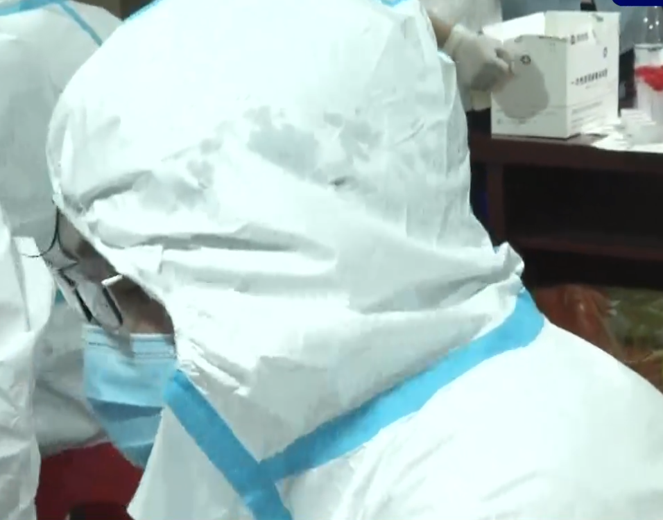 在检测现场,居民大多身着短袖,但现场的检测人员却身着密不透风的防护服,加班加点做检测。在镜头中,这些医护人员一直在低头忙碌,有的医护人员防护服已被汗水浸透↓