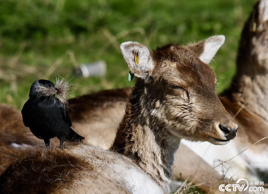 胆大妄为!爱尔兰一只寒鸦为筑巢在鹿身上拔毛。