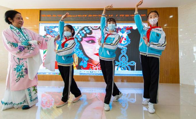 文艺志愿者在河北省秦皇岛市山海关区铁路小学教孩子们学习京剧姿势。