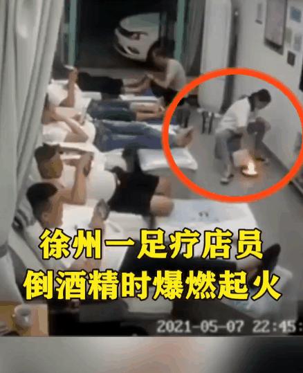 ·吓人!江苏徐州一足疗店员倒酒精瞬间爆燃起火,躺椅上一排人窜起逃跑。