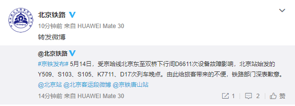 据中国铁路北京局官方微博消息,5月14日,受京哈线北京东至双桥下行间D6611次设备故障影响,北京站始发的Y509、S103、S105、K7711、D17次列车晚点。由此给旅客带来的不便,铁路部门深表歉意。