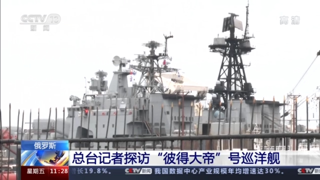 13日,总台记者在赴俄罗斯“北极三叶草”军事基地的途中,经停俄罗斯“北莫尔斯克”海军基地,并实地探访了停靠在那里的俄罗斯海军北方舰队的旗舰——“彼得大帝”号巡洋舰。