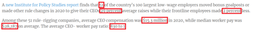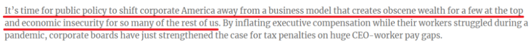 用该报告主要作者萨拉·安德森的话说:“现在是公共政策将美国企业从一种为顶层的少数人创造繁荣、为我们大多数人创造不稳定的商业模式中转变出来的时候了。”