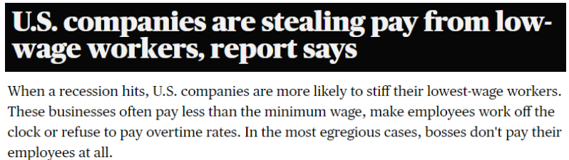根据美国哥伦比亚广播公司(CBS)的说法,当经济状况不佳时,美国的企业给低收入工作者发放的工资会低于法定最低工资,以及拒绝支付加班费等;一些企业甚至根本不支付员工工资。但相关企业却很少受到相应处罚,很多低收入人员被进一步推向贫困。