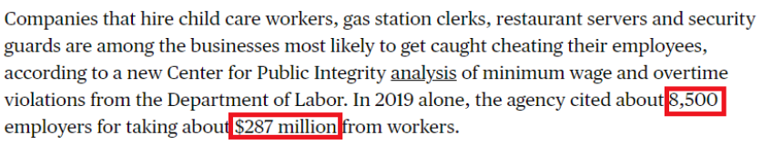 美国非盈利新闻调查机构“公共诚信中心”(CPI)分析指出,雇佣护理人员、加油站职员、餐厅服务员和保安等人员的企业是最有可能压榨低收入工作人员的企业。相关数据显示,仅2019年就有约8500家企业通过各种方式,从众多低收入工作者身上“盗取薪资”约2.87亿美元。