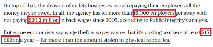 一些经济学家说,工资盗窃是如此普遍,以至于工人每年至少损失150亿美元,“远远超过每年实际抢劫案中的金额损失”。