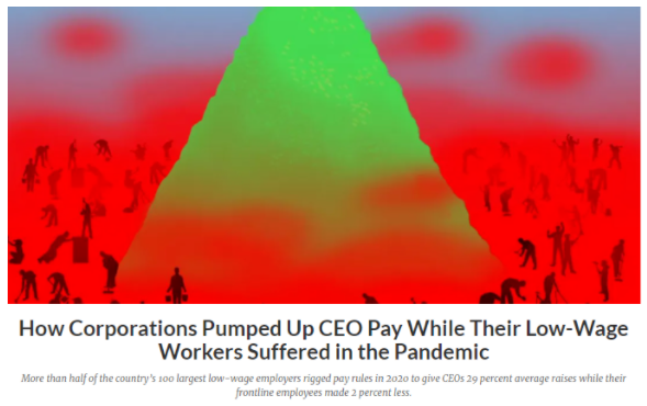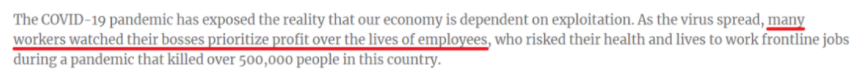 报告指出,像以往一样,新冠肺炎大流行“暴露了美国经济依赖剥削的现实”。随着病毒的传播,许多工人看到他们的老板将利润置于员工的生命之上,这些员工冒着健康和生命危险在一场导致该国50多万人死亡的疫情期间工作在第一线,而当这些低薪工人勇敢地面对疫情时,他们的CEO却从中获利。