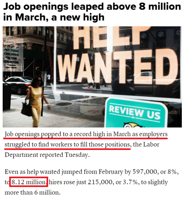 美国劳工部11日发布报告称,今年3月美国的岗位空缺高达812万个,为自2000年12月以来的最高纪录。该数据明确表明,美国就业市场供需不匹配的结构性问题突出,这种状况或将导致美国疫情后经济复苏速度低于预期。