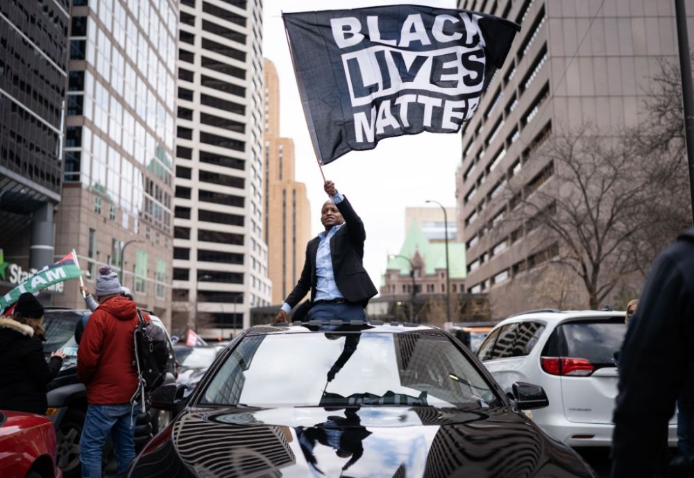 4月20日,得知肖万被控的谋杀和过失杀人等三项罪名全部成立后,民众手举“黑人的命也是命”标语的旗帜聚集在美国明尼阿波利斯市的法庭附近。新华社发