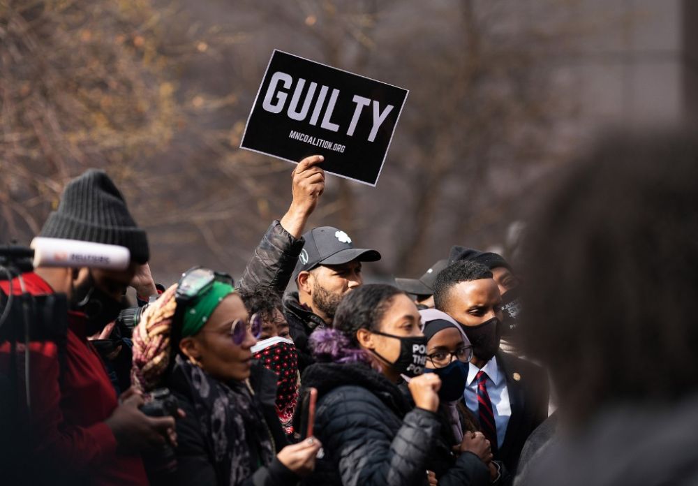 4月20日,得知肖万被控的谋杀和过失杀人等三项罪名全部成立后,民众手举“有罪”的标语聚集在美国明尼阿波利斯市的法庭附近。新华社发
