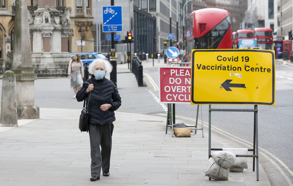 3月31日,一名戴口罩的女子走过英国伦敦一家新冠疫苗接种中心外的标识牌。新华社记者韩岩摄