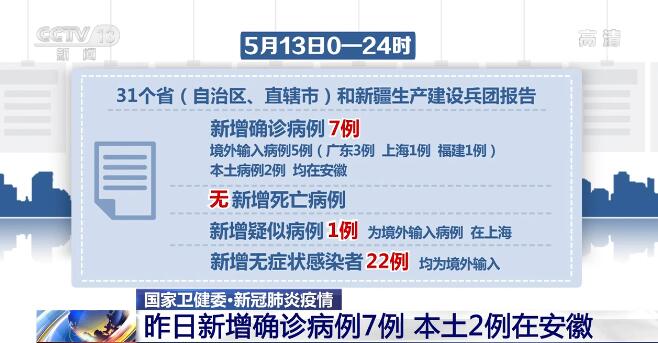 5月13日0—24时,31个省(自治区、直辖市)和新疆生产建设兵团报告新增确诊病例7例,其中境外输入病例5例,其中广东3例,上海1例,福建1例,本土病例2例,均在安徽;无新增死亡病例;新增疑似病例1例,为境外输入病例,在上海。新增无症状感染者22例,均为境外输入。