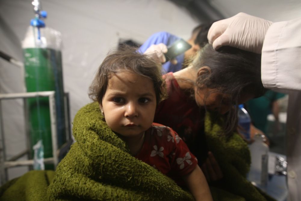 5月13日,在加沙地带城市拉法,在空袭中受伤的巴勒斯坦儿童接受治疗。(新华社发,哈利德·奥马尔摄)