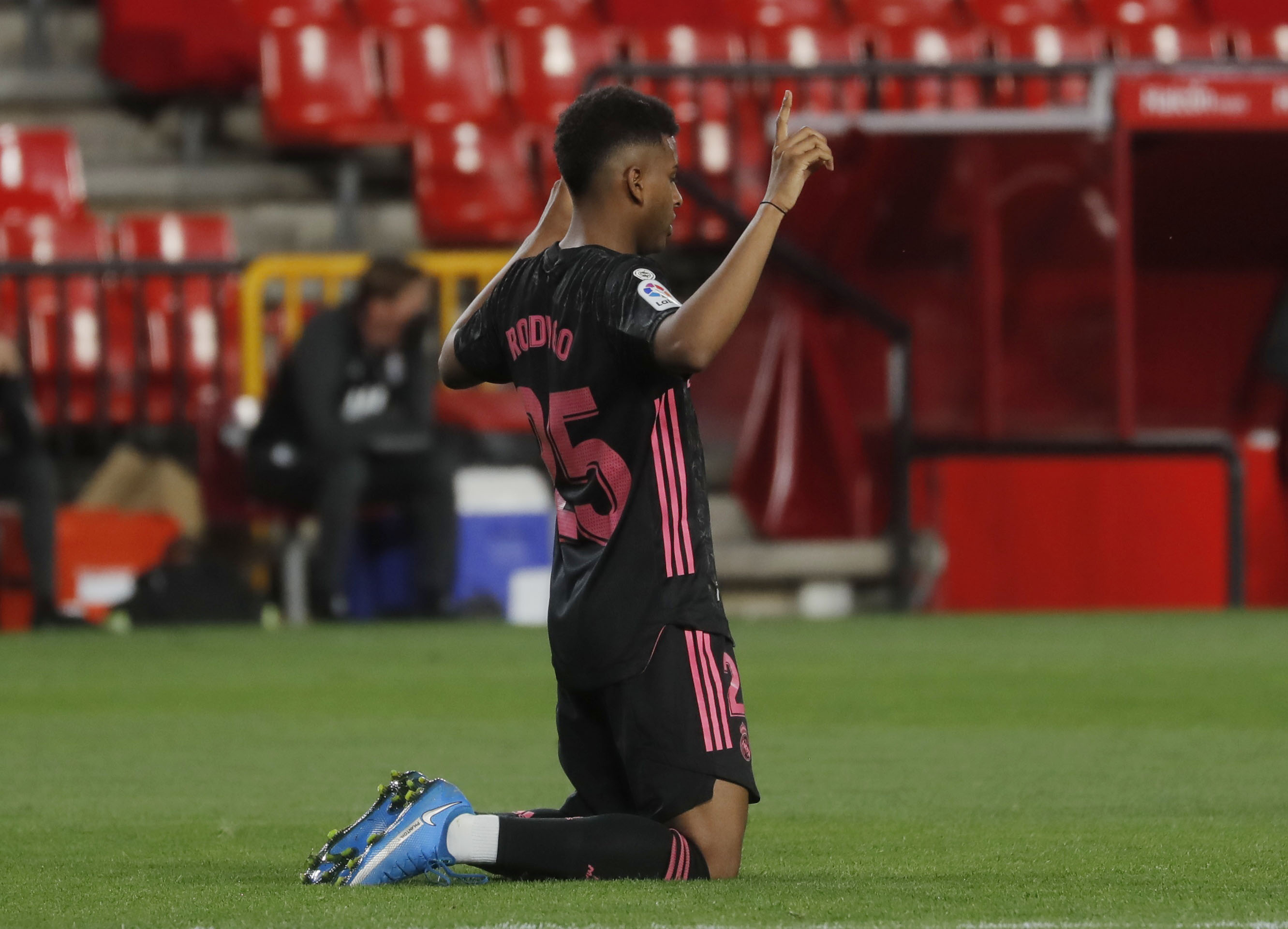 皇家马德里队球员罗德里戈在比赛中庆祝进球。新华社发