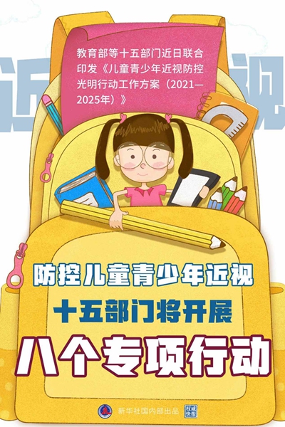 教育部等十五部门近日联合印发《儿童青少年近视防控光明行动工作方案(2021—2025年)》,共同实施八个专项行动防控儿童青少年近视。工作方案提出,力争到2025年每年持续降低儿童青少年近视率,有效提升儿童青少年视力健康水平。