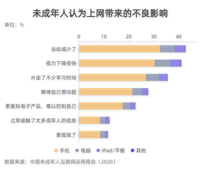 近年来,青少年使用电子产品机会和上网时间的增多,也直接导致了许多儿童身体素质下降和视力损害。调查显示,未成年人认为不同终端上网带来的不良消息影响中,“视力下降很快”和“运动减少”这两项占的比例最高。