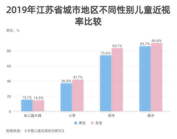 根据《中国儿童近视状况研究》报告里的数据显示,中国女生近视率(42.2%)总体高于男生(37.7%);与男生相比,女生更容易发展成近视甚至高度近视,其近视和高度近视的风险分别是男生的1.29倍和1.37倍。一些局部地区的调查结果也证实了这一点。