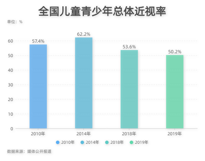 教育部联合国家卫健委开展的全国儿童青少年近视情况调查结果显示,2018年全国儿童青少年总体近视率为53.6%,2019年全国儿童青少年总体近视率为50.2%,较2018年下降了3.4个百分点。受疫情影响,2020年全国儿童青少年总体近视率较2019年有小幅上升,但与2018年相比仍有下降,基本实现预期防控目标。