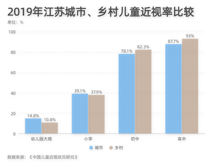 调查显示,中国城市地区的儿童总体近视率约为48.8%,显著高于乡村地区儿童的近视率(31.9%)。但是在不同阶段尤其在中学阶段,有调查结果显示乡村儿童近视率反超城市儿童。以江苏省为例,该地区幼儿园大班和小学阶段城市儿童近视率高于乡村儿童,初中和高中阶段城市儿童近视率低于乡村儿童,显示出乡村儿童在小学至初中阶段近视增长率高于城市儿童,需要重点防控。