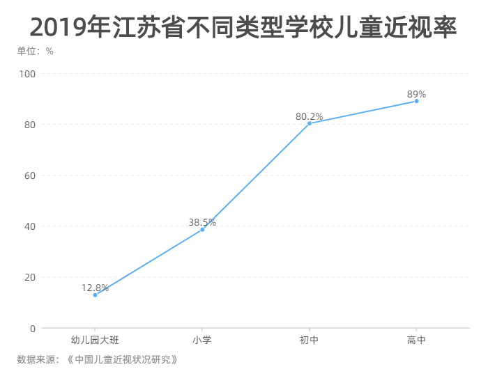 中国儿童近视率随年龄的增长呈现上升趋势。以江苏省2019年的调查结果为例,该省幼儿园大班儿童近视率为12.8%,小学阶段增长至38.5%,初中阶段增长至80.2%,显示出近视率在小学和初中阶段增长速度较快,说明低年龄阶段是近视防控的重点阶段。