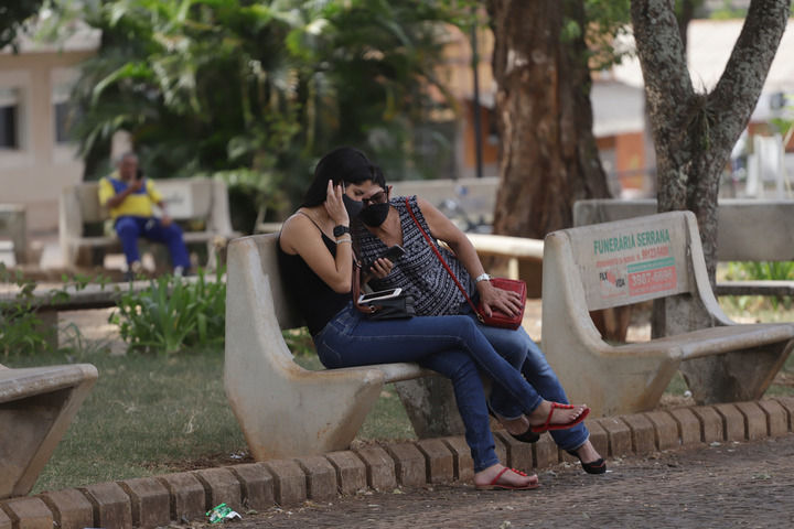 5月11日,在巴西塞拉纳市,两名女子坐着看手机。新华社发(拉赫尔·帕特拉索摄)