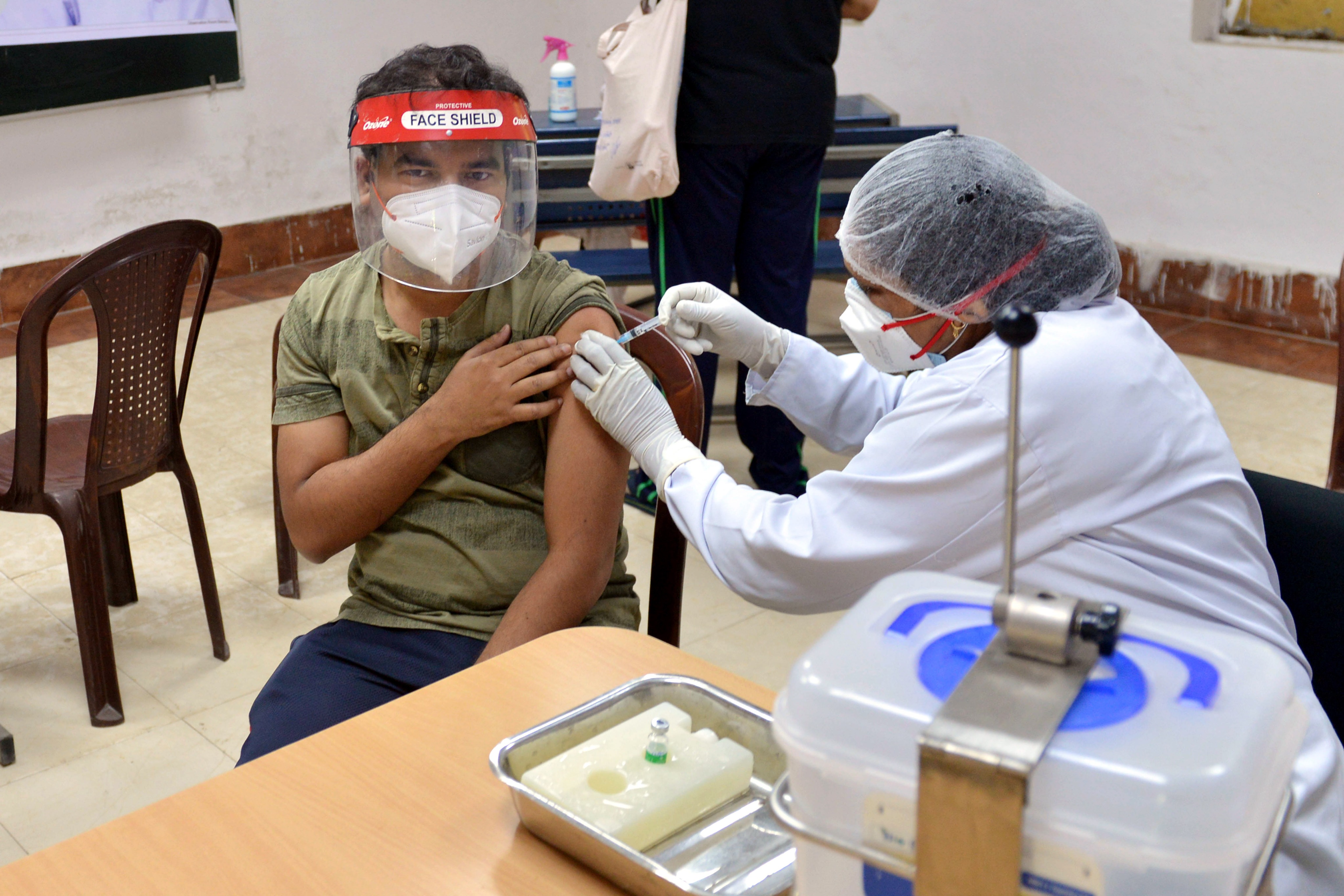 5月12日,一名男子在印度德里接种新冠疫苗。(新华社发,帕塔·萨卡尔摄)