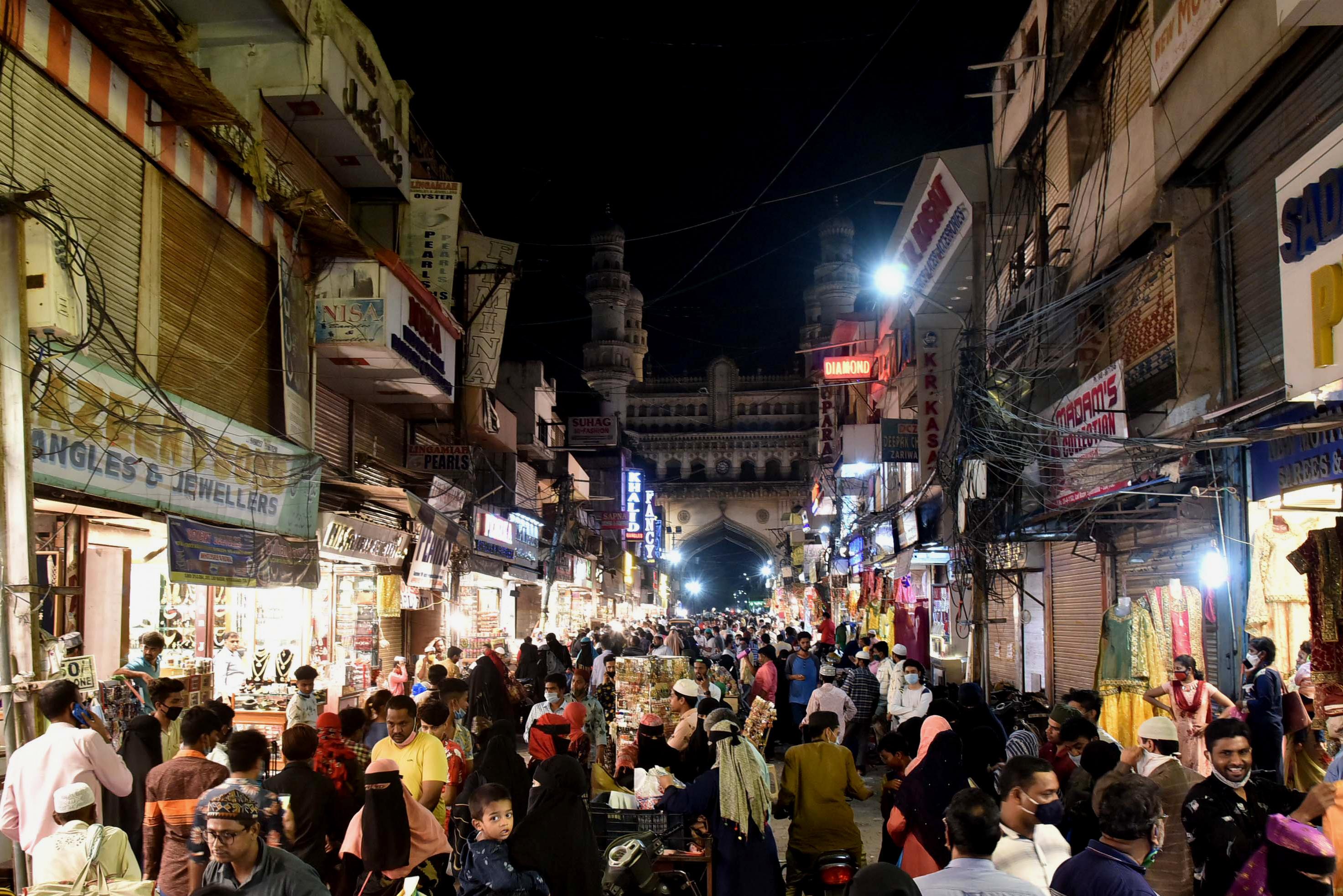 5月11日“封城”前夕,印度海得拉巴大批民众聚集到老城市场抢购物品。(新华社发)