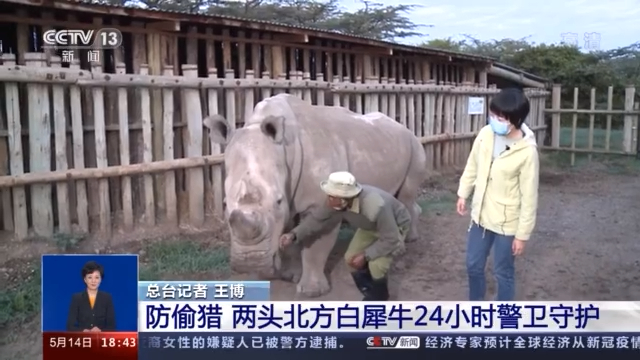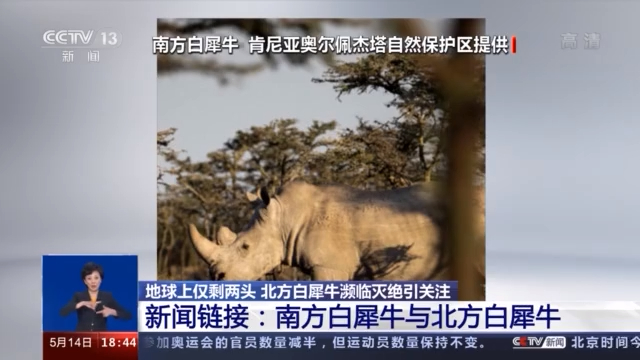 总台记者 王博:我现在已经到了奥尔佩杰塔自然保护区,在我身后不到十米的距离,有三头白犀牛,最左边的这一头是南方白犀牛,右边这两头就是目前地球上仅存的两头北方白犀牛。它们现在吃的这个饲料是专门为它们准备的营养套餐。