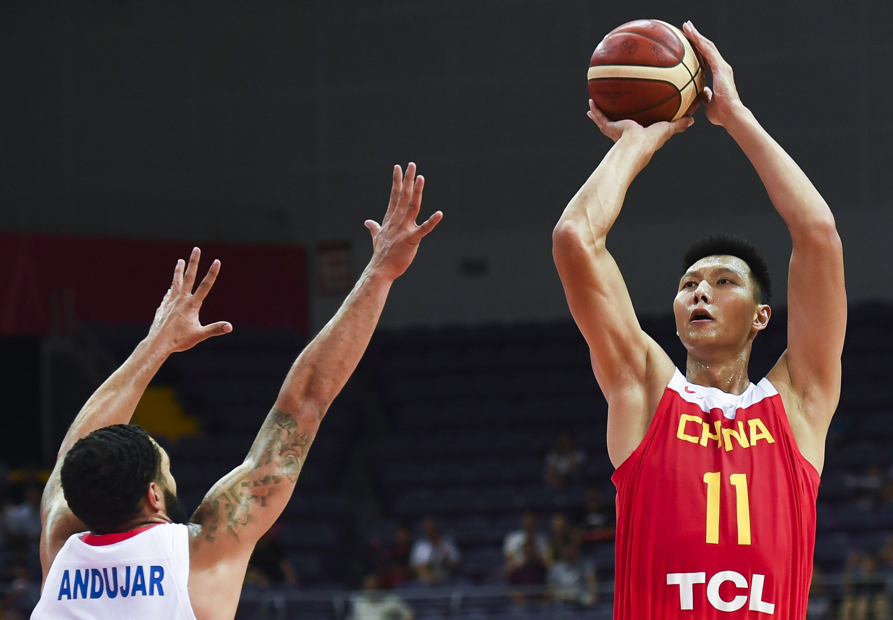 资料图:中国队球员易建联(右)在比赛中投篮。新华社记者季春鹏摄