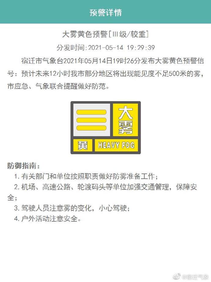 江苏省宿迁市气象台2021年05月14日19时26分发布大雾黄色预警信号:预计未来12小时我市部分地区将出现能见度不足500米的雾,市应急、气象联合提醒做好防范。