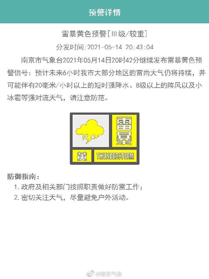 江苏省南京市气象台2021年05月14日20时42分继续发布雷暴黄色预警信号:预计未来6小时我市大部分地区的雷雨天气仍将持续,并可能伴有20毫米/小时以上的短时强降水、8级以上的阵风以及小冰雹等强对流天气,请注意防范。
